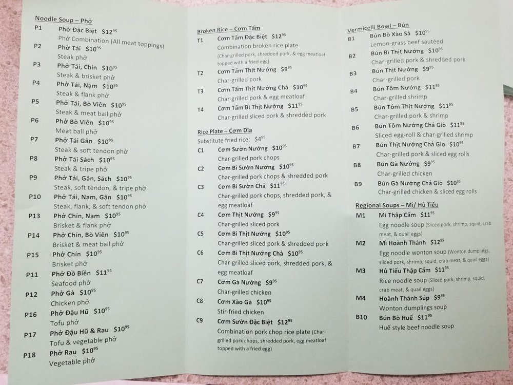 - Com Tam: No visit is complete without the Com Tam Dac Biet, featuring chargrilled pork and a fried egg for $12.95, or the tasty Com Tam Thit Nuong for $9.95.